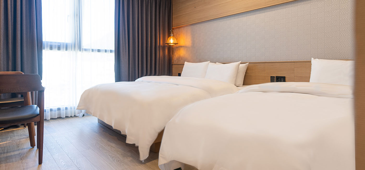 가족/친구와 함께 오기 좋은 호텔 로다의 트윈 룸, 투 베드로 방해받지 않는 편안한 숙면과 편의를 제공해 드립니다.